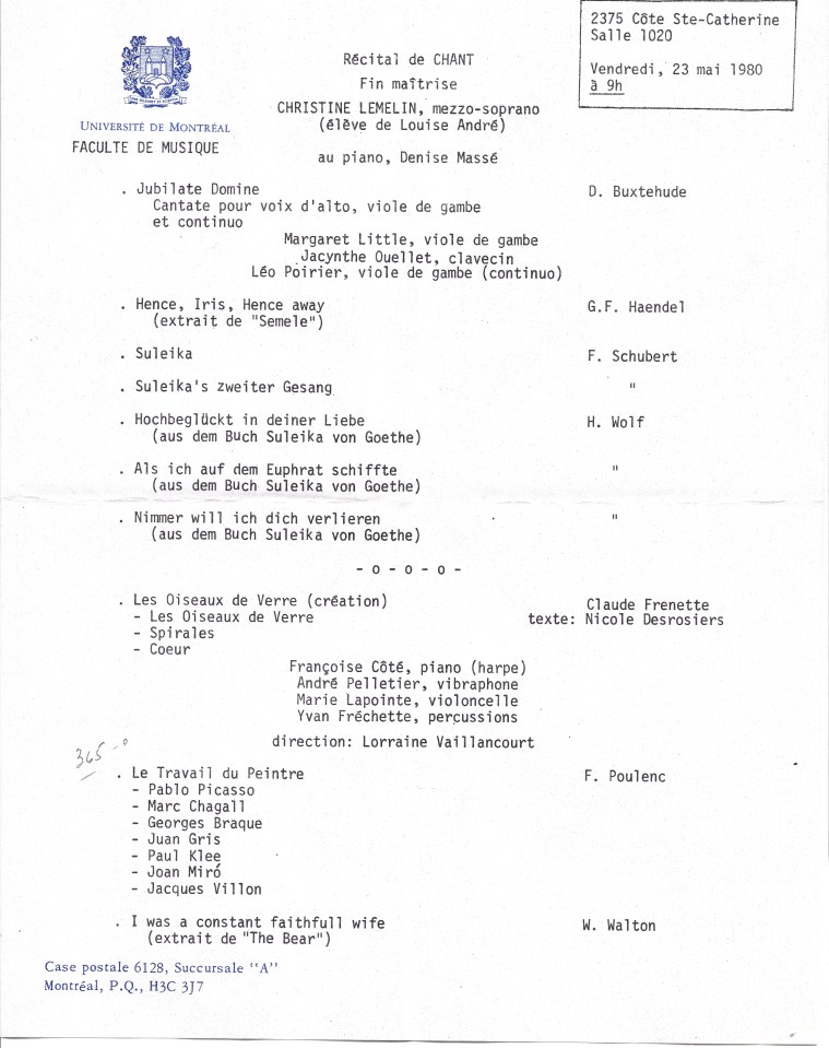 Christine Lemelin; Claude Frenette; Denise Massé; Margaret Little; Lorraine Vaillancourt; Faculté de Musique Université de Montréal;