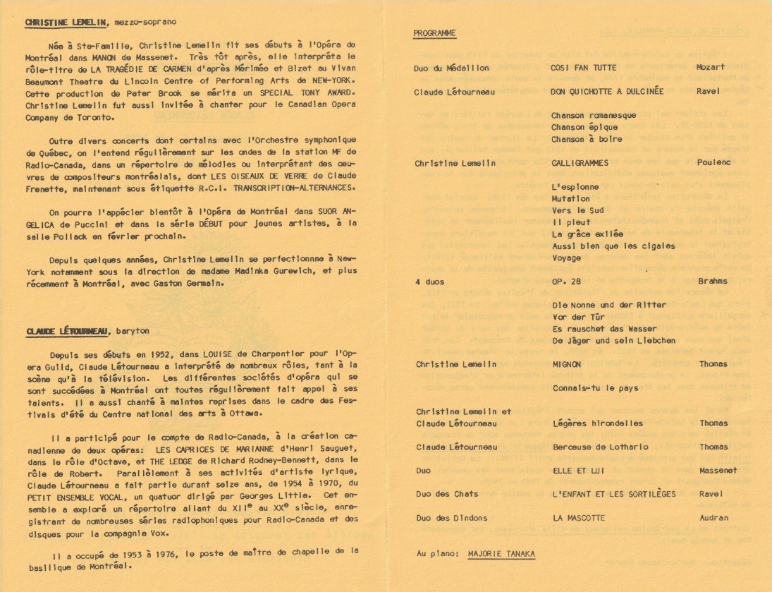 *Tournée qui, finalement, n’a pas eu lieu et qui m’avait également fait renoncer à un contrat avec l’Opera Piccola du couple Léopold Simoneau et Pierrette Alarie, à Victoria, B.C., dans Albert Herring de Benjamen Britten.