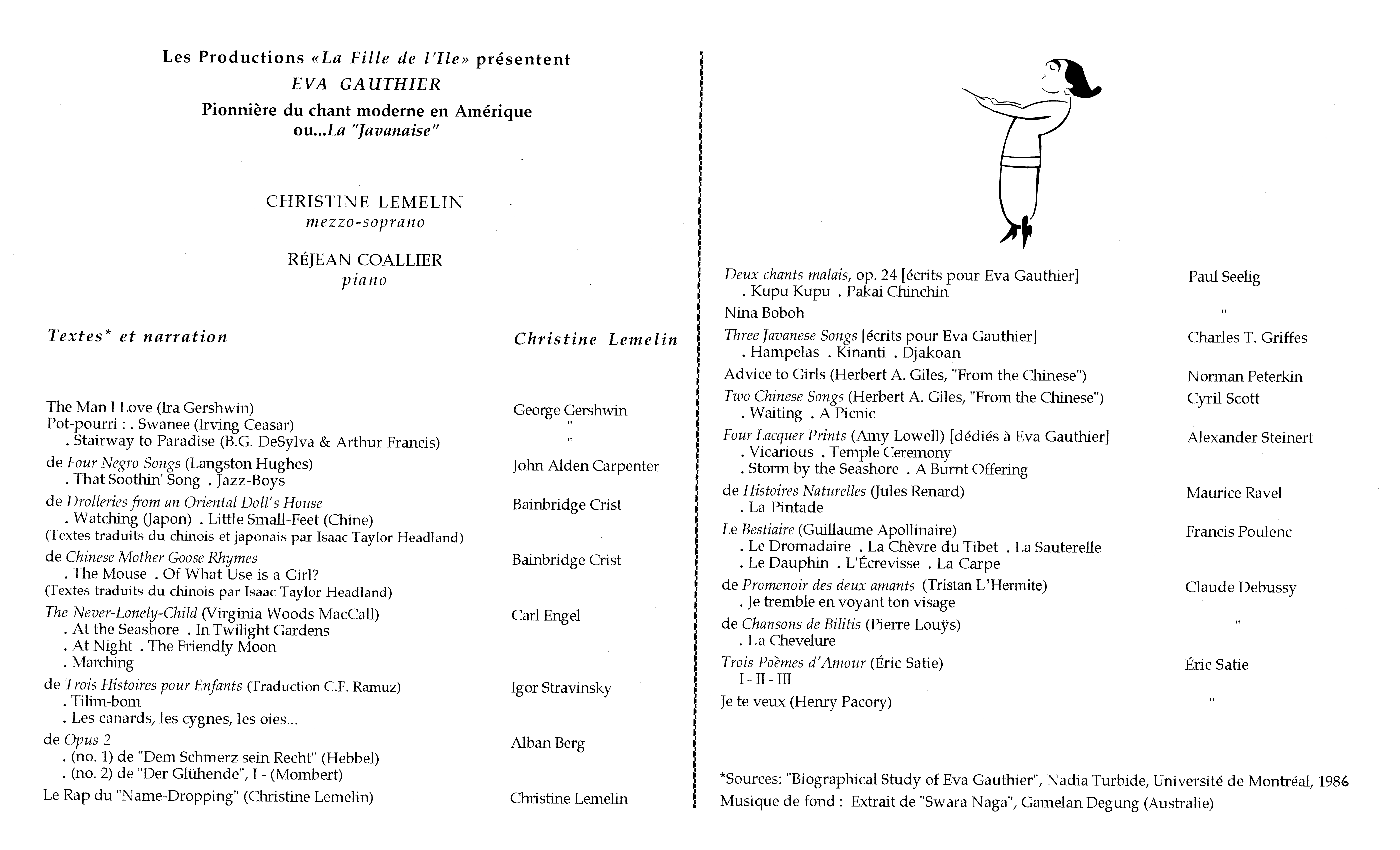 Éva Gauthier, Pionnière du Chant Moderne en Amérique ou… la « Javanaise » – Programme ← Précédent Titre et date du spectacle; carricature d’Enrico Caruso; liste des oeuvres J’aime chargement…